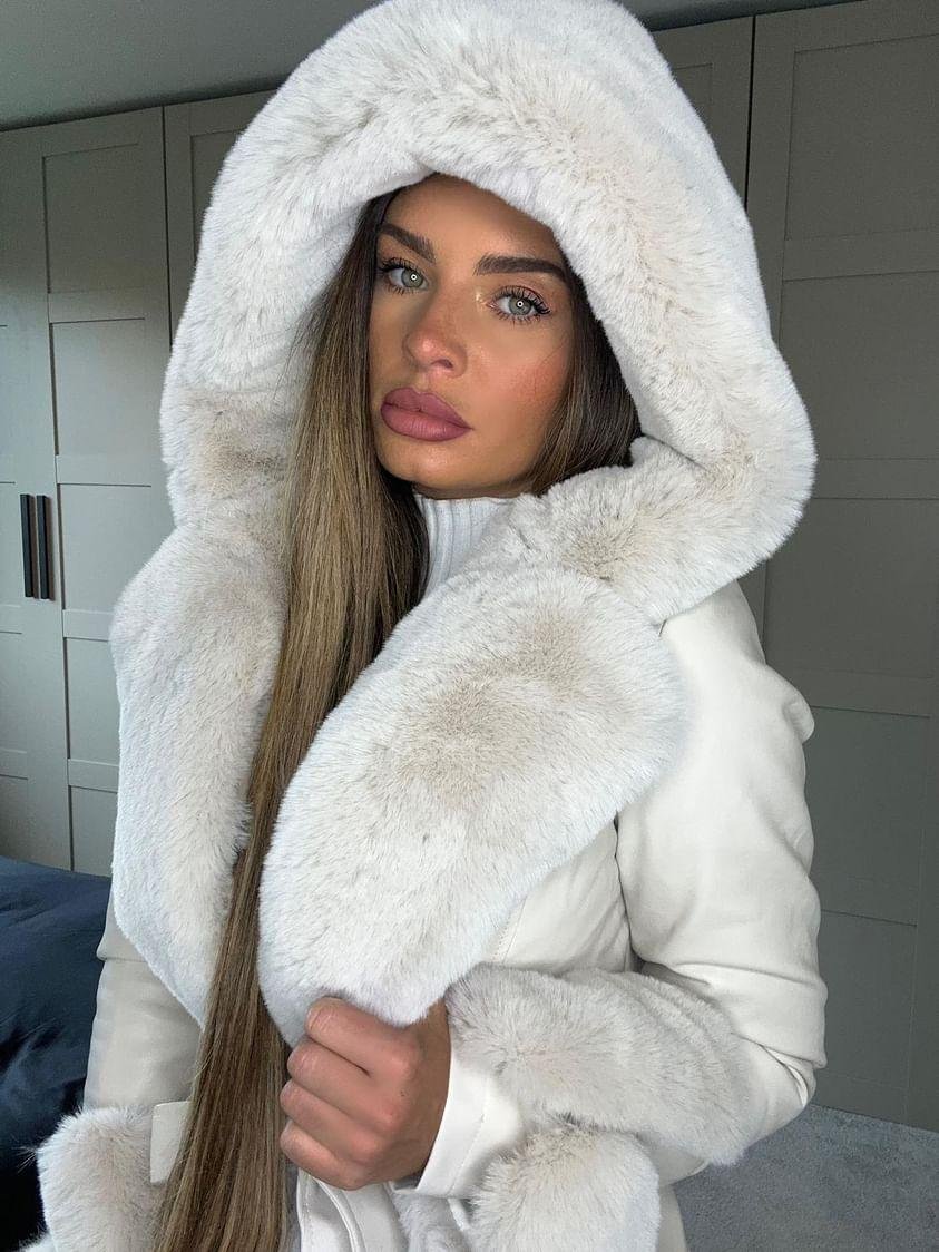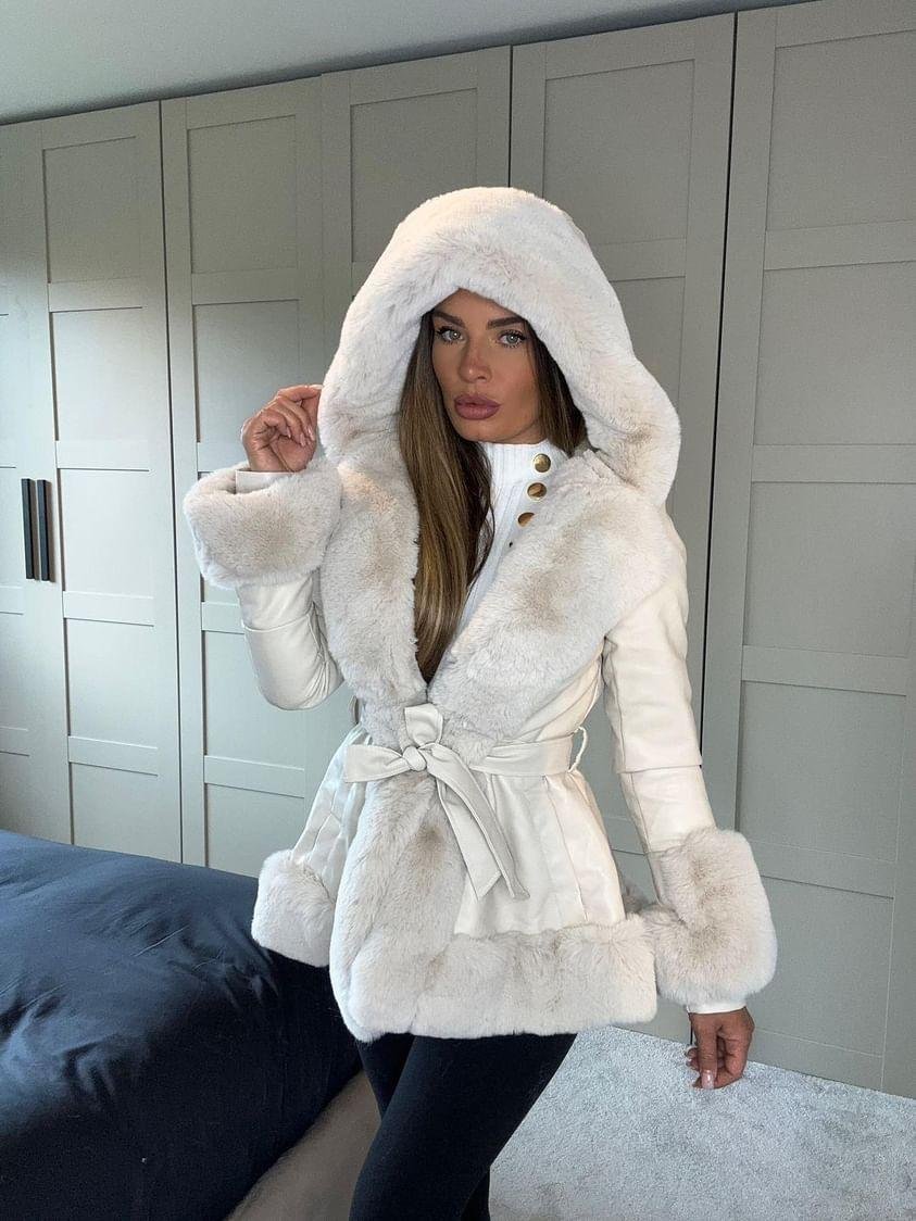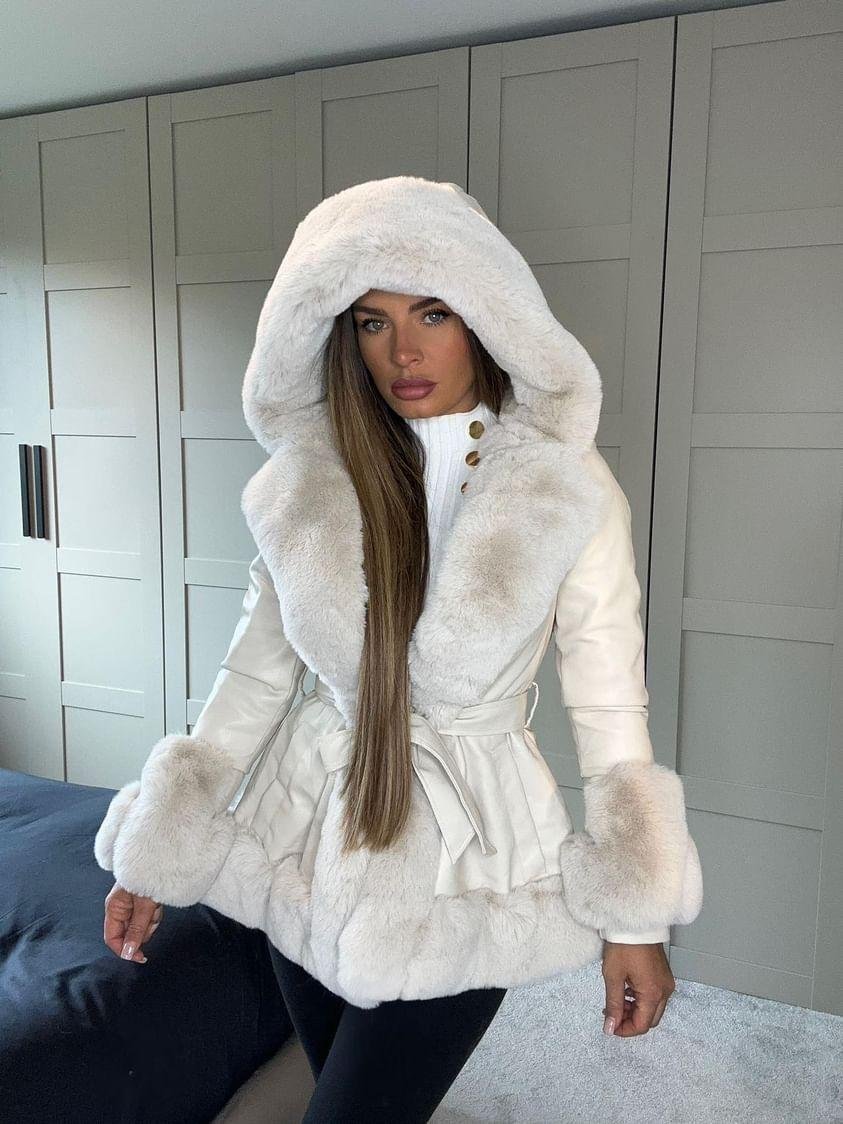 Get warm in this beautiful coat this winter season. Made from soft faux fur and leather featuring belt.