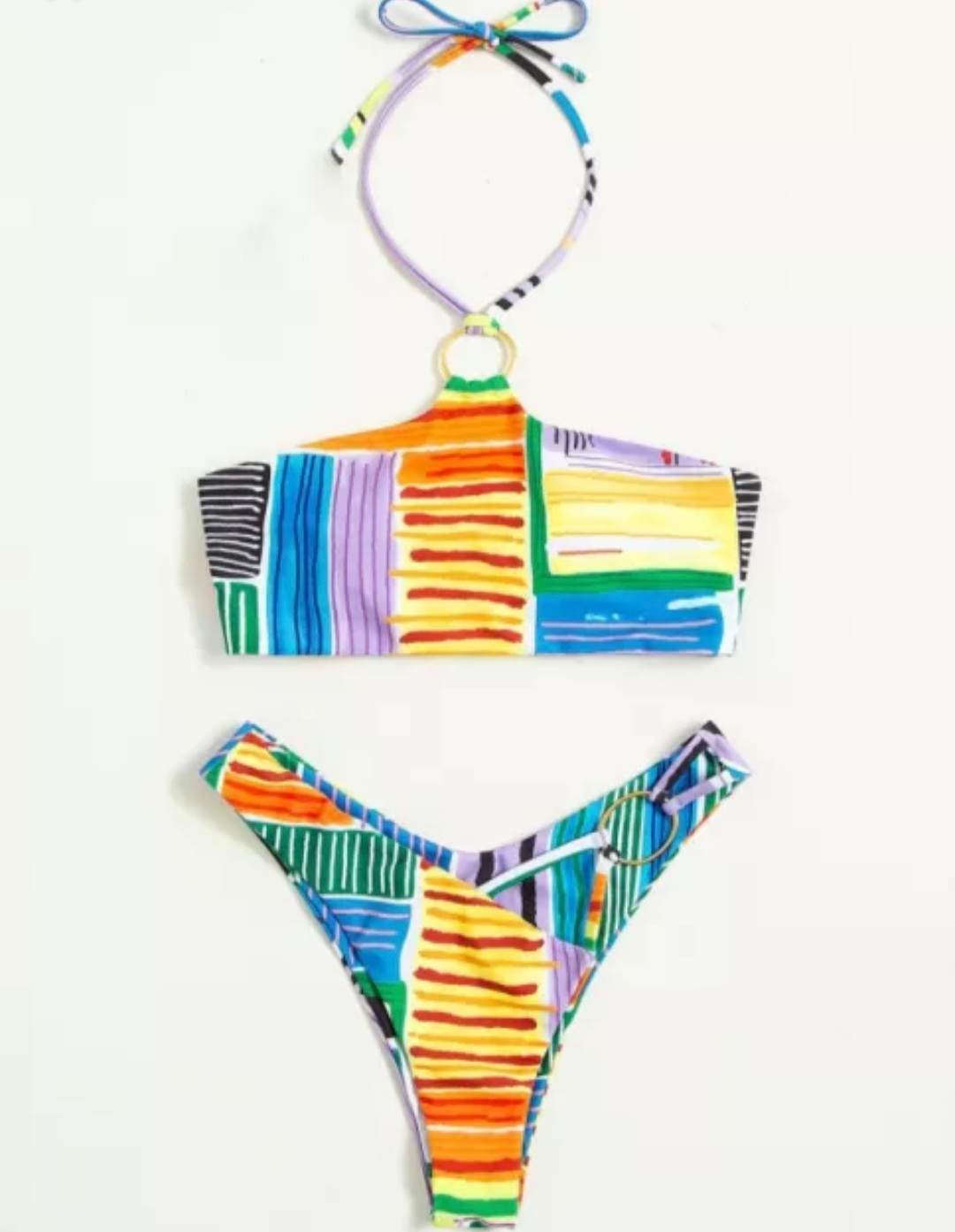 The headlines will love this bikini. Featuring a multi colour double layer swim material and a neck tie padded bikini top and cut out bikini bottom.