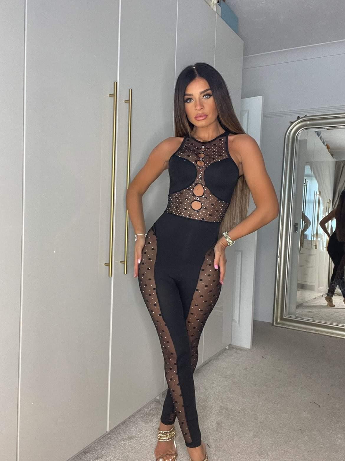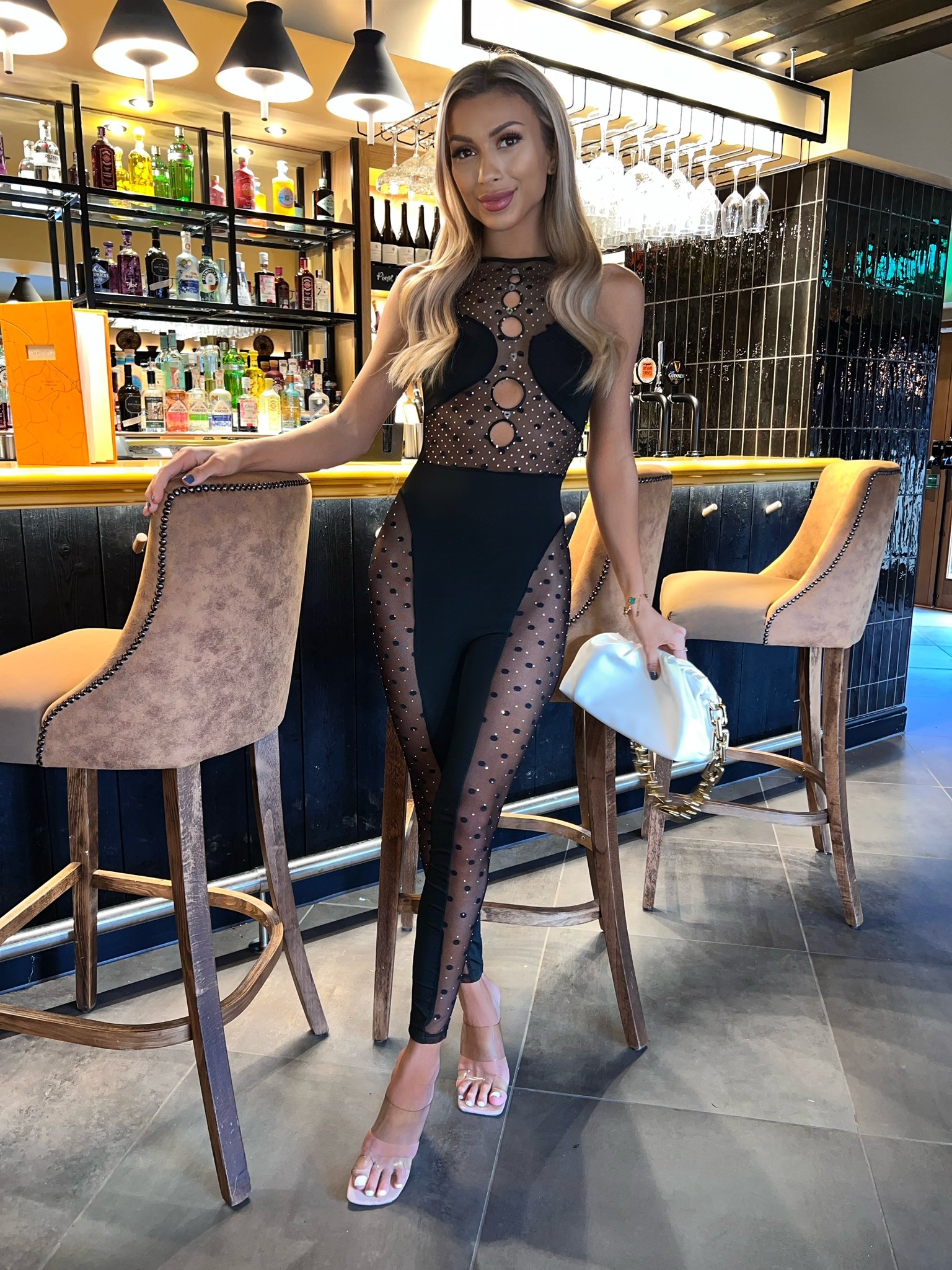 Show off your gorgeous figure in our ‘Coraline’ jumpsuit! This super chic style is made from stretchy mesh fabric with diamante establishments. Pair it with high heels for perfect night out look.