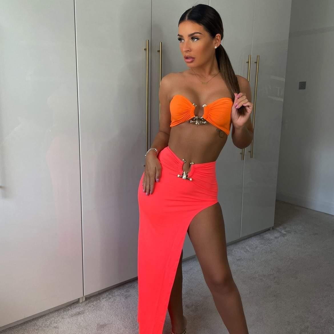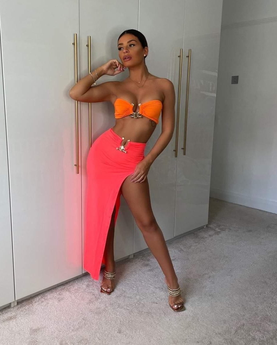 This Two Piece Set is must have this summer season. Made from soft stretchy fabric. Features crop top and the asymmetric slid midi shirt with the gold hardware. Pair it with high heels for perfect look.