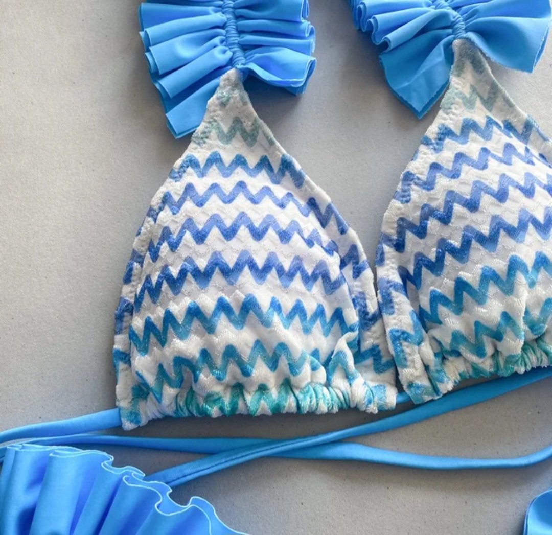 How gorgeous is our Ezre Ruched 3 piece set. This set features bikini top and bottom with ruched detailing and ruched bikini cover skirt.
