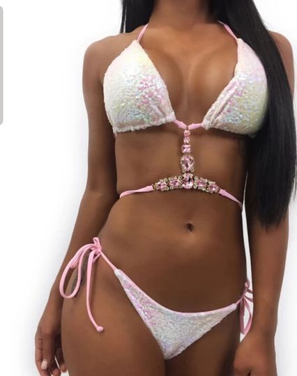 Look like ultimate goddess in this sparkly sequin bikini. It features an iridescent sequin fabric with waist jewel.