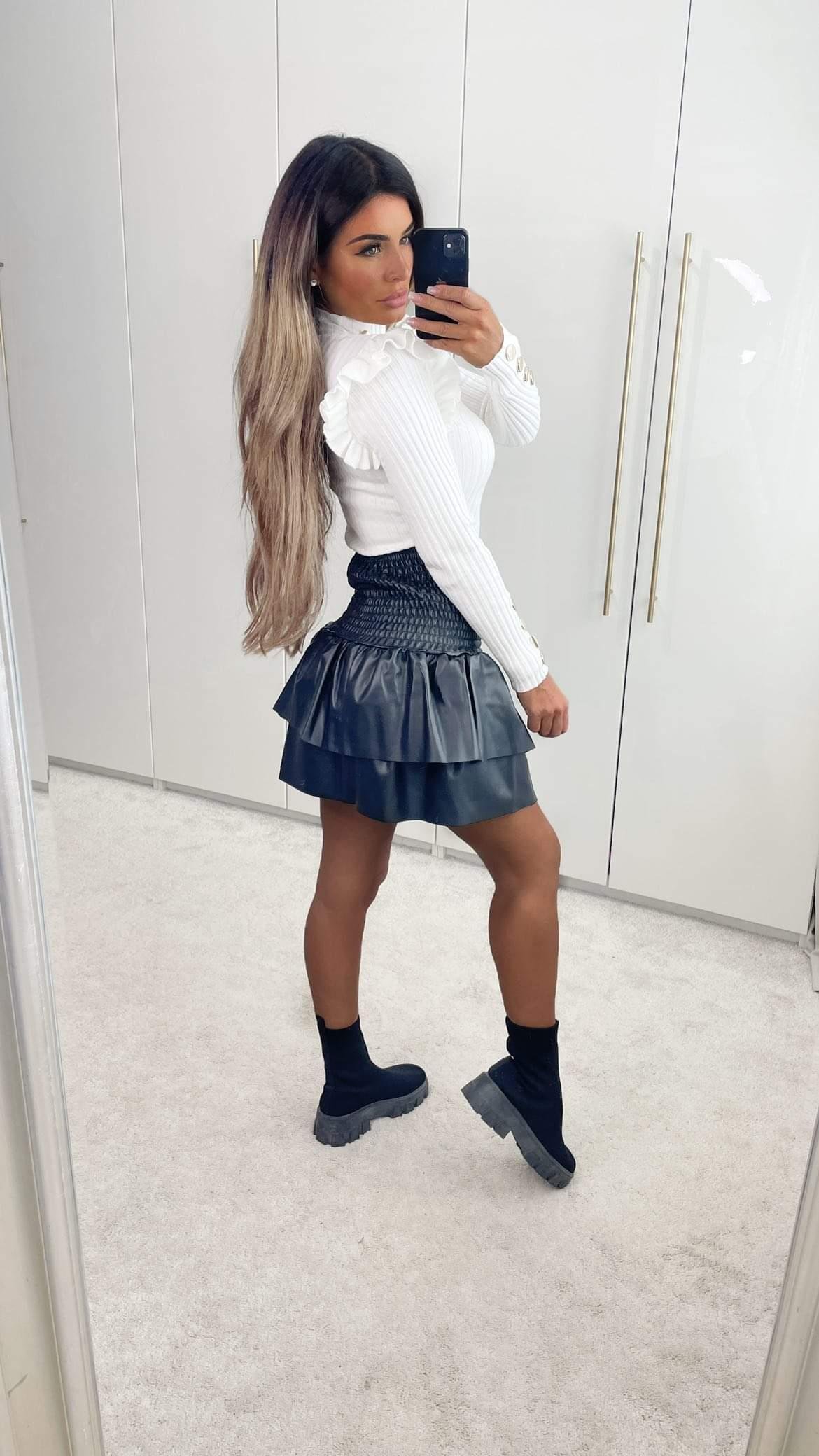This skirt is must have this Autumn Winter season!! This piece features an elasticated waistband, tiered look and comes in a vegan leather material. Pair it with our Jackie Knitted Frill Top for perfect look.